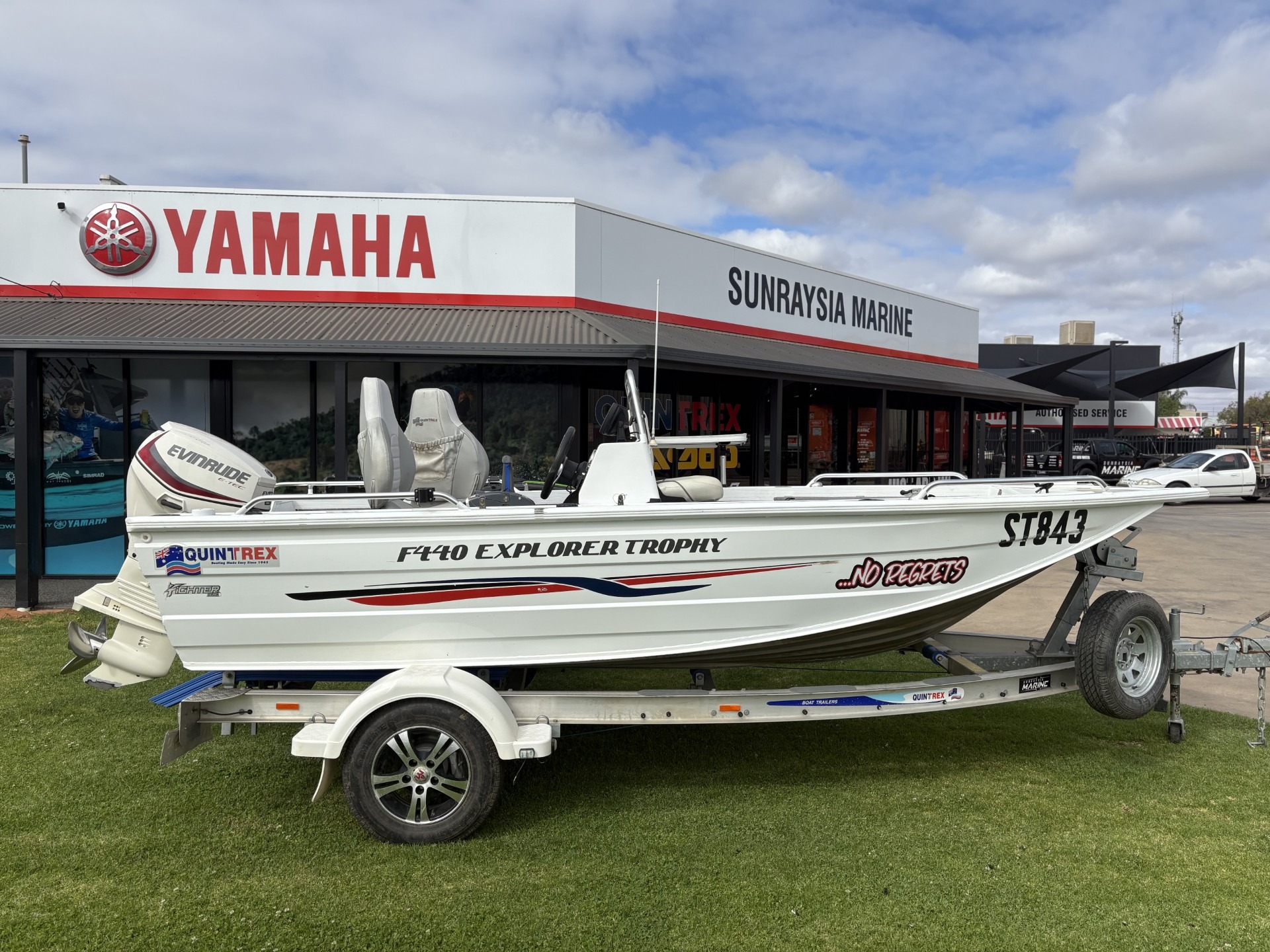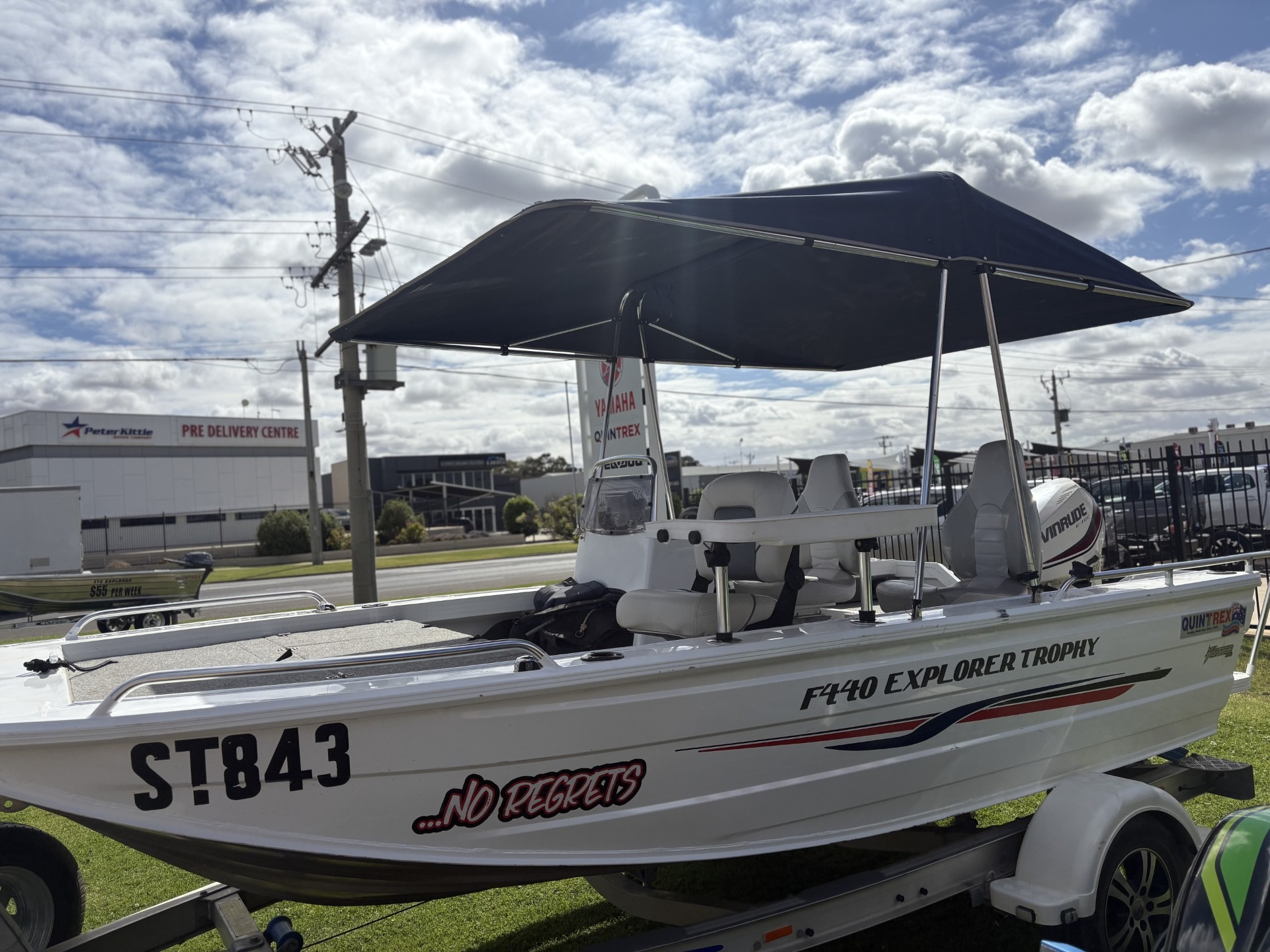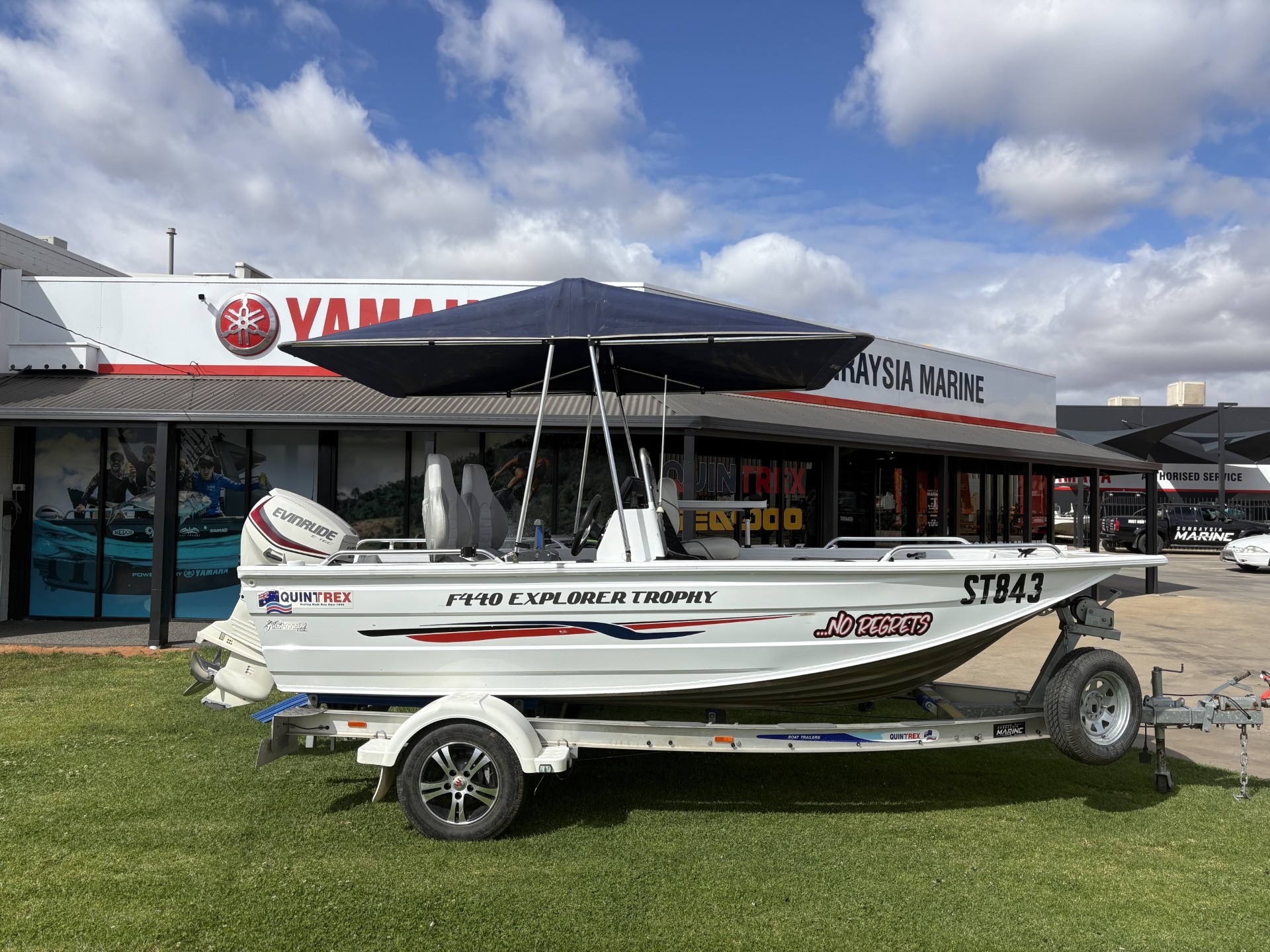2016 QUINTREX F440 2016 EVINRUDE ETEC *LOW HOURS - 110* KING FISHER BIMINI BAIT BOARD FUSION STERO HUMMINBIRD FISH FINDER S/S PROP UNDERFLOOR FUEL TANIK NAV LIGHTS 3X QUINTREX SEATS TRAVEL COVER SPARE WHEEL CARRIER & SPARE WHEEL